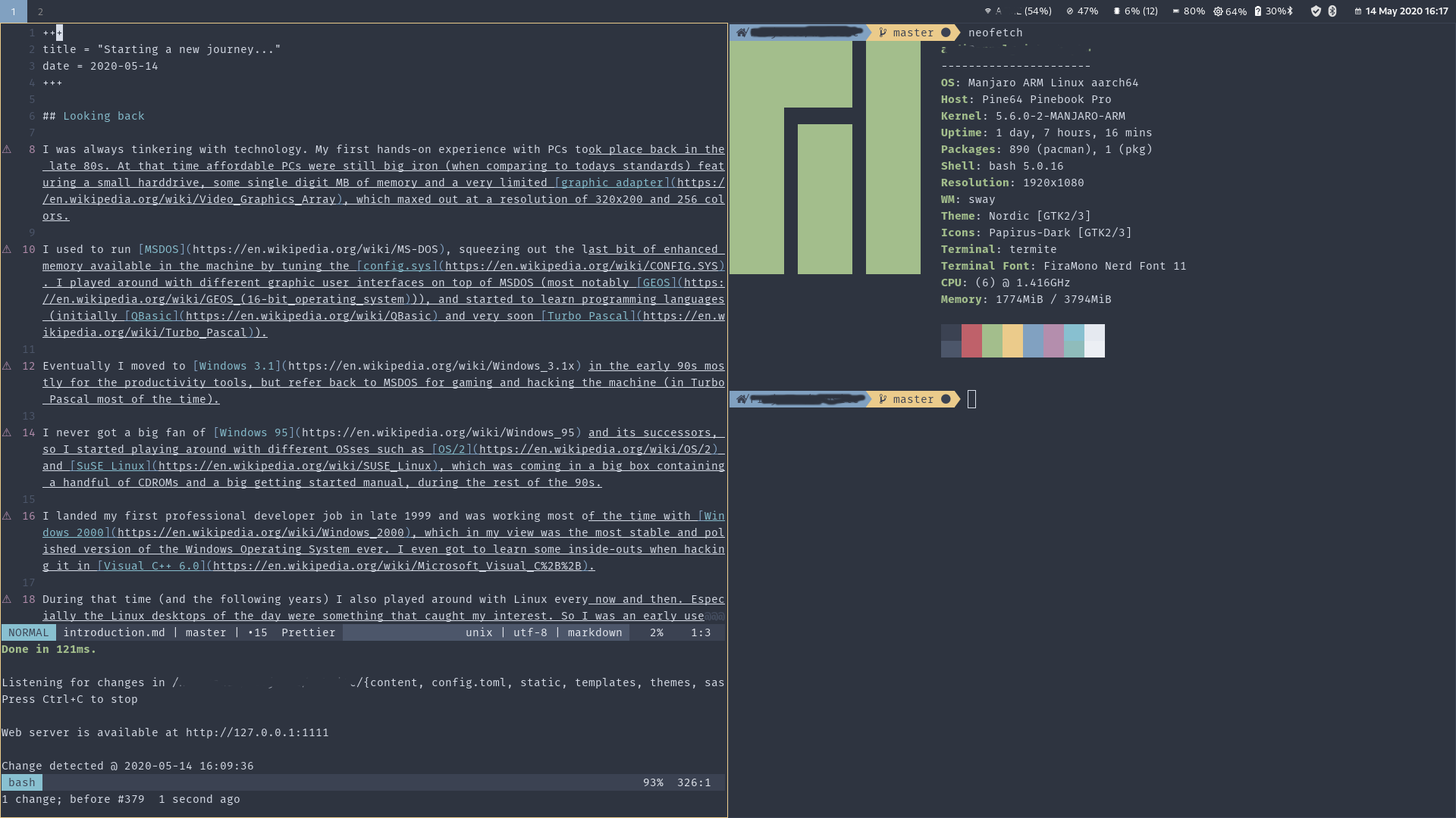 So after visiting FOSDEM this year I ordered myself a Pinebook Pro and started tinkering with Manjaro Linux on ARM again. The experience so far has been great for such a low-cost device. I went with a custom build based on Wayland and SwayWM as I really like the idea of a tiling window manager.